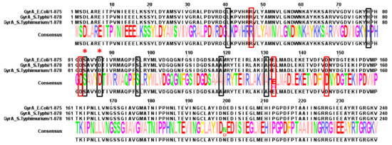 Summary of mutations found in GyrA. Red boxes indicate residues found to be mutated in typhoidal Salmonella. Black boxes indicate residues found to be mutated in non-typhoidal Salmonella (discussed below) and “*” indicate residues found to be mutated in both.