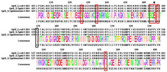 Summary of mutations found in GyrB. Red boxes indicate residues found to be mutated in typhoidal Salmonella. Black boxes indicate residues found to be mutated in non-typhoidal Salmonella (discussed below) and “*” indicate residues found to be mutated in both.