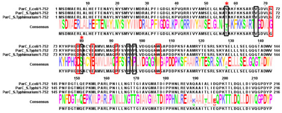Summary of mutations found in ParC. Red boxes indicate residues found to be mutated in typhoidal Salmonella. Black boxes indicate residues found to be mutated in non-typhoidal Salmonella (discussed below) and “*” indicate residues found to be mutated in both.