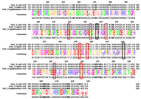 Summary of mutations found in ParE. Red boxes indicate residues found to be mutated in typhoidal Salmonella. Black boxes indicate residues found to be mutated in non-typhoidal Salmonella (discussed below).
