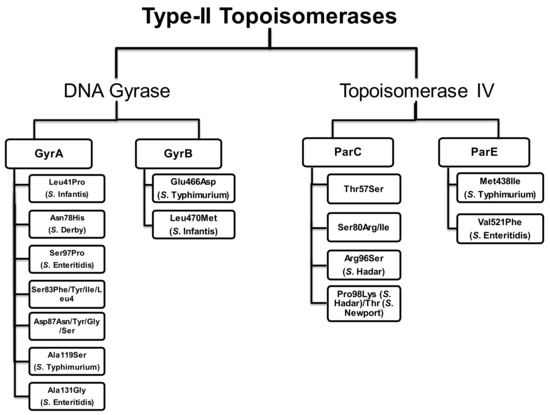 Non-typhoidal Salmonella (NTS) are most often contracted through the consumption of contaminated food and water. While the thermal processing of food is considered to be an effective method to eliminate NTS, NTS infections caused by the consumption of thermally treated food are still reported around the globe. The predominant serovars of foodborne Salmonella are S. Typhimurium, S. Enteritidis, S. Newport, S. Indiana, S. Kentucky, and S. Virchow [103,104]. There have been many studies on mutations in the QRDRs of S. Enteritidis and S. Typhimurium, because of their universal prevalence and because they cause most gastroenteritis-associated infections. Other Salmonella serovars are less often associated with gastroenteritis and so there are less studies on their QRDR mutations.