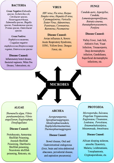 Microbes are single-celled micro-organisms. They are so small that thousands of them can fit onto the point of a needle and can only be seen through a microscope. Microbes are the oldest forms of life on our planet [17], and microbial traces date back to over 3.5 billion years ago. The waste would not rot without microbial growth, and therefore less air would be accessible to breathe. Such microbes are present nearly everywhere–in food, soil, bone, water, humans, animals, and plants. Microbes are also considered microscopic creatures because they can exist everywhere around the environment. Some of them thrive in the cold, and others survive the extreme heat. Certain microbes require oxygen while others do not. Some microbes primarily induce certain forms of infectious conditions [17,18]. Fungi, parasites, bacteria, and viruses are all different classes of microbes. There are several common infections that are triggered by microbes. For example, Influenza can be caused by bacteria, fungi, protozoa, or viruses [19]. Inflammatory Bowel Disease is caused by bacteria [20]. Onychomycosis is caused by fungi [21]. Severe Acute Respiratory Syndrome (SARS) is caused by a virus [22]. Babesiosis is caused by Protozoa [23]. Protothecosis is caused by algae [24]. Gastrointestinal endogenous is caused by Archea [25,26] (Figure 1).