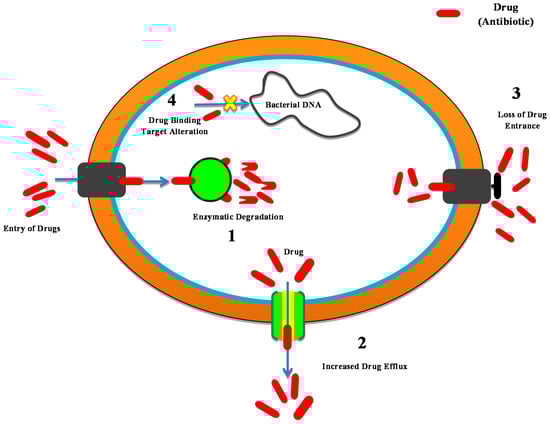 Development of the mechanism of resistance in bacteria. 1. Antibiotic enzyme inactivation/degradation. 2. Excretion of the drug through the use of efflux pumps. 3. Reduced absorption by variations in the external membrane permeability. 4. Drug target modifications.