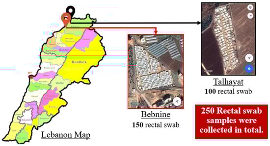 Between June and July 2019, 250 rectal swabs were collected from the inhabitants of two Syrian refugee camps, located in North Lebanon, in the Akkar Governorate (Figure 1). One hundred random samples were collected from the Talhayat camp and another 150 from the Bebnine camp. The swabs were grouped according to whether they came from residents of the same tent and/or family. The swabs were inserted through the rectal sphincter 1–1.5 inches (2–3 cm) and rotated gently. Tubes containing the swabs were placed in a refrigerator (2–8 °C), after checking that faecal material was visible on the tip of the swab. The swabs were directly shipped to the laboratory (less than 1.5 h away) where they were directly cultivated on Tryptic soy broth (TSB) medium (Becton Dickinson GmbH, Heidelberg, Germany).