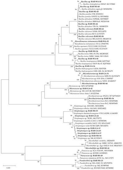 The representative isolates with different morphotypes were identified by colony PCR [85]. In brief, for cell lysis, the culture broths (2 mL) were centrifuged at 14,000× g for 10 min and the obtained pellets were suspended in 50 µL nuclease-free water. Subsequently, the cell suspension was stored at −20 °C for 2 h, followed by incubation at 98 °C for 10 min. The 16S rRNA gene of the isolates was directly amplified with universal primers 27f (5′-AGAGTTTGATCCTGGCTCAG-3′) and 1492r (5′-GGTTACCTTGTTACGACTT-3′) [86] with the following PCR program: an initial denaturation at 94 °C for 5 min, followed by 30 cycles of denaturation at 94 °C for 1 min, annealing at 56 °C for 50 s, amplification at 72 °C for 1.5 min, and a final extension at 72 °C for 7 min. The 16S rRNA gene sequencing was carried by the ABI PRISM 3100® Genetic Analyzer (Applied Bioscience and Hitachi, Foster City, CA, USA). The sequences were quality checked, and low-quality regions were removed from the sequence ends using BioEdit software v.7.2.6.1. The quality-checked sequences of the isolates were compared to available sequences in the NCBI GenBank using the BLAST searching program with the megablast algorithm and the database nt. The sequences were aligned using the ClustalW algorithm and the phylogenetic tree of 16S rRNA sequences was created by the neighbor joining algorithm with 1000 bootstraps using MEGA v.7.0.0.