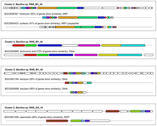 In the case of the genome of Bacillus sp. RAR_M1_44, it contains 16 BGCs, including clusters related to the biosynthesis of terpene, siderophore, betalactone, nonribosomal peptide (NRP), type III polyketide, bacteriocin, others and unknown compounds. Several BGCs shared their identity to the biosynthesis clusters of known compounds in the MIBiG database, such as carotenoid, fengycin, lichenysin, teichuronic acid, and bacilysin with the identities of 50–85% (Table 8). The gene structures of BCGs having the identities > 70% with known compound clusters in the MIBiG database are shown in Figure 3.