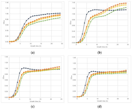 Each different growth condition was evaluated in triplicate wells on three independent assays. During the 24 h of incubation at 37 °C with shaking (150 rpm), optical density at 600 nm (OD600) for each well were obtained automatically every hour, using the FLUOstar OPTIMA (BMG LABTECH, Ortenberg, Germany) microplate reader. For each isolate, OD600 was calculated by subtracting the average OD600 of the three blank wells (fresh BHI broth or fresh BHI broth with guar gum at 7.5 mg/mL) from the average of OD600 of the three replicates of the sample under evaluation. Final result corresponds to the average results of each independent assay replicates.