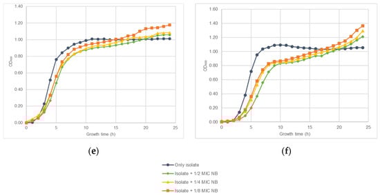 Growth curves obtained for S. aureus clinical isolates during 24 h at 37 °C with shaking (150 rpm) in the absence or in the presence of different sub-MICs of nisin-biogel. Results are presented as mean values of three independent assays, reflecting bacterial growth for each S. aureus clinical isolate under the different conditions tested. (a): Strain ID A 5.2, isolated from a DFI aspirate (agrI +; spA +; atl +; clfA +; coa +; icaA +; icaD +; Biofilm production +; MSSA). (b): Strain ID A 6.3, isolated from a DFI aspirate (agrI +; spA +; atl +; clfA +; coa +; icaA +; icaD +; Biofilm production +; MSSA). (c): Strain ID B 1.1, isolated from a DFI biopsy (agrI +; spA +; atl +; clfA +; coa +; icaA +; icaD +; Biofilm production +; MRSA). (d): Strain ID B 14.2, isolated from a DFI biopsy (agrI +; spA +; atl +; clfA +; coa +; icaA +; icaD +; Biofilm production +; MRSA). (e): Strain ID Z 1.1, isolated from a DFI swab (agrI +; spA +; atl +; clfA +; coa +; icaA +; icaD +; Biofilm production +; MRSA). (f): Strain ID Z 5.2, isolated from a DFI swab (agrI +; spA +; atl +; clfA +; coa +; icaA +; icaD +; Biofilm production +; MSSA). MIC: minimum inhibitory concentration. NB: nisin-biogel. OD600: optical density at 600 nm.