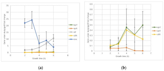 S. aureus expresses a multitude of virulence factors in a coordinated manner, and many of them are under the control of the agr quorum sensing system. The agr gene positively controls the expression of many exotoxins, mainly produced after the end of the exponential growth phase, allowing bacteria to spread from the colonization sites to deeper tissues, and negatively controls the transcription of some cell wall-associated proteins, mainly synthesized during exponential growth []. According to our results, agrI expression levels by the S. aureus isolates tested only started to be relevant after 4 h, a period during which bacterial adherence to the host tissues already occurred in vivo. At this time point, the cell-surface proteins start to be down-regulated, whereas the virulence genes associated with bacterial dissemination and biofilm formation start to be up-regulated [,,]. Peng et al. [] showed that agr activity is required for post-exponential phase expression of various secreted proteins, which supports the fact that in the present study agr mRNA expression has its peak at 6 h.