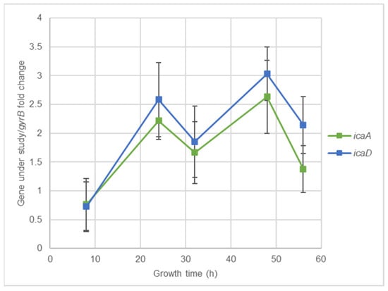 One of the most relevant staphylococcal virulence factors is biofilm production, conferring bacteria a wide range of adaptive advantages that contribute to bacteria survival and persistence in the host []. Thus, icaA and icaD, involved in icaADBC-dependent biofilm formation, are mainly expressed latter during S. aureus growth. According to Atshan et al., 2013, icaA and icaD are up-regulated at 24 h of S. aureus growth and not at 48 h as observed in the present study, which suggests that ica mRNA expression kinetics may differ between S. aureus strains []. Furthermore, Patel et al. [] evaluated gene expression during Staphylococcus epidermidis biofilm formation and, in accordance with the present study, the expression levels of icaA and icaD at 48 h were the highest ones. Although this study focused on S. aureus, S. epidermidis also produces biofilm in an icaADBC-dependent manner, allowing to suggest that the time frame required for the expression of icaA and icaD may be identical in both species.