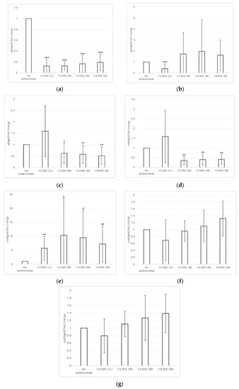 (a–g): Effects of nisin-biogel at 1/2 MIC, 1/4 MIC and 1/8 MIC and clindamycin at 1/2 MIC on agrI, spA, atl, clfA, coa, icaA and icaD mRNA expression, respectively. Results are expressed as n-fold differences in the ‘gene under study/gyrB’ ratio in the presence of the different conditions described above relative to ‘gene under study/gyrB’ ration in the growth control (no antimicrobial). Values are means ± SD (two repeated different experiments). Asterisks indicate statistically significant differences between treatments and control (* = p < 0.05; ** = p < 0.01; *** = p < 0.001). NB: nisin-biogel; CLI: clindamycin; MIC: minimum inhibitory concentration. agrI: accessory gene regulator I; spA: gene encoding staphylococcal protein A; atl: gene encoding autolysin; clfA: gene encoding clumping factor A; coa: gene encoding coagulase; icaA: gene encoding intracellular adhesin A; icaD: gene encoding intracellular adhesin D; gyrB: gene encoding gyrase B.