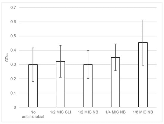 Biofilm formation by S. aureus DFI isolates in the presence of nisin-biogel and clindamycin at sub-MICs was determined using a microtiter assay. Results shown in Table S2 (available as Supplementary Data) demonstrate that different S. aureus clinical isolates have different responses to nisin-biogel and clindamycin at sub-MICs. In Figure 5 it is possible to observe that, overall, nisin-biogel at 1/4 and clindamycin at 1/2 MIC exhibit a trend to increase the ability of S. aureus isolates to form biofilm, and, in the presence of nisin-biogel at 1/8 MIC, biofilm formation significantly increases. Oppositely, nisin-biogel at 1/2 MIC had no effect in the ability of S. aureus clinical isolates to form biofilm.