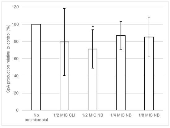 Effects of nisin-biogel at 1/2 MIC, 1/4 MIC and 1/8 MIC and clindamycin at 1/2 MIC on SpA production by S. aureus DFI isolates. Results are the ratios of the amount of SpA (pg/mL) in the bacterial supernatants incubated with nisin-biogel and clindamycin to the mean amount of SpA (pg/mL) incubated without antimicrobials and are expressed as supernatants. Values are presented as mean values ± SD. Asterisks indicate statistically significant differences between treatments and control (* = p < 0.05). NB: nisin-biogel; CLI: clindamycin; MIC: minimum inhibitory concentration. SpA: staphylococcal protein A.