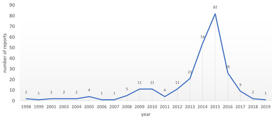 From the 252 ADR reports submitted over a period of about 20 years, 82 (34%) reports were submitted in 2015 as illustrated by Figure 1. A sharp increase in the number of reports was observed in the three consecutive years with 21 in 2013, 54 in 2014, and 83 in 2015. The numbers dropped to 26 reports in 2016, but in just these four years, Lareb received 73% (183 of 252) of AMR-relevant reports received over a period of 20 years. In this short period of sharp increase, there was a clear increase of tobramycin reports passing from 11 in 2013 to 30 in 2014 and reaching 39 in 2015. Colistin shows a visible increase of ADR reports in this period, passing from 0 in 2013 to 10 in 2014 and 14 in 2015. Other drugs with increasing ADR reports numbers in the spike period include aztreonam and doxycycline. Of the 183 reports submitted in the period 2013–2016, 84 reports were on suspected “off label use” with a predominance of tobramycin that was the suspect drug in 50 (of 84) reports. 39 of the 183 reports were submitted with the PT “drug ineffective” and diverse antibiotics were reported as suspected drugs. However, with reports coded using the PT “product use in unapproved indication” indication, a clear predominance of tobramycin was observed.