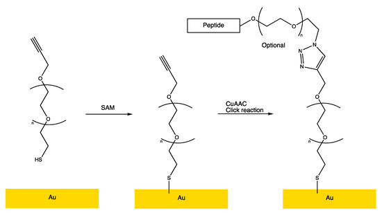 In the present study, the quantitative effect of antimicrobial peptides covalently attached to a surface upon the colonization of an avidly biofilm-forming bacterium, Staphylococcus epidermidis, was investigated. A gold surface with a polyethylene glycol (PEG) self-assembled molecular monolayer (SAM) was chosen as the model system since its preparation is a versatile and established technique [30]. A chemically addressable SAM monolayer composed of α-thio-PEG-ω-alkyne monolayers that spontaneously form on the Au (111) surface was used as the experimental platform because the peptides could be introduced as azide derivatives on the alkyne-molecular monolayer through a copper(I)-catalyzed alkyne-azide cycloaddition (CuAAC) reaction [31]. The use of a common surface where the peptides were covalently linked through the same chemical reaction allows for the preparation of a set of similar surfaces that differ only in the presence of an additional PEG linker and the type of peptide, and subsequently allows for the determination of a structure–activity relationship involving these features (Figure 1).