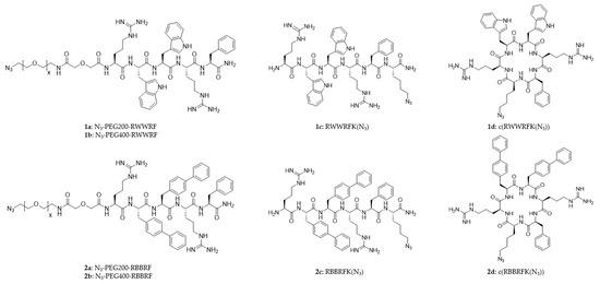 The peptides were designed according to the pharmacophore of cationic antimicrobial peptides [27,33], with five or six residues containing two arginine residues and three bulky and lipophilic moieties in the form of tryptophan, phenylalanine, and 4′-phenyl-phenylalanine (biphenylalanine, B) [34,35]. Series 1 (1a–d) contains tryptophan as the major hydrophobic group, while Series 2 (2a–d) contains biphenylalanine as the main hydrophobic amino acid. The selection of tryptophan and biphenylalanine as bulky and lipophilic residues in the peptides was made to ensure a wide distribution of antimicrobial activity. All peptides adhere to the minimum motif for antimicrobial activity, and the increased bulkiness and lipophilicity of biphenylalanine over tryptophan ensures a higher antimicrobial efficacy of the Series 2 peptides compared to the Series 1 counterparts [34,35,36,37]. All peptides had a phenylalanine residue close to the amidated C-terminus. One peptide from each series was cyclized to investigate whether the anti-colonization efficacy was affected by the decrease in conformational freedom resulting from cyclization. Half of the peptides, 1c, 1d, 2c, and 2d, contained an azido-lysine residue used for a direct surface connection. The effect of linking the peptide directly to the Au–SAM or through an additional PEG linker was also included in the study using PEG200-linked peptides (1a and 2a) and PEG400-linked peptides (1b and 2b). An overview of the peptides prepared for the study is shown in Figure 3.