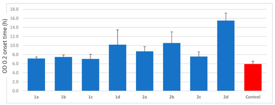 Certika assay with Au–SAM surfaces functionalized with peptides 1a–d and 2a–d as well as the control using the biofilm-forming bacterium S. epidermidis RP62A as a challenge. The diagram shows the OD 0.2 onset time in hours for all surfaces.