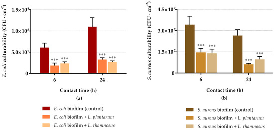 Figure 1. Culturability of 24 h biofilms of E. coli (a) and S. aureus (b) after 6 h and 24 h of contact with probiotics (L. plantarum or L. rhamnosus). The data present the mean and standard deviation (SD) of at least three independent experiments. Statistically significant differences between the control and treatment were considered for p-values < 0.05 (*** indicates p < 0.001).