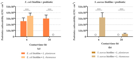 Figure 2. Culturability of attached L. plantarum and L. rhamnosus cells after 6 h and 24 h of contact with E. coli (a) and S. aureus (b) biofilms. The data present the mean and SD of at least three independent experiments. Statistically significant differences between probiotic strains for each time point were considered for p-values < 0.05 (*** indicates p < 0.001). “◯” indicates that no colonies were detected.