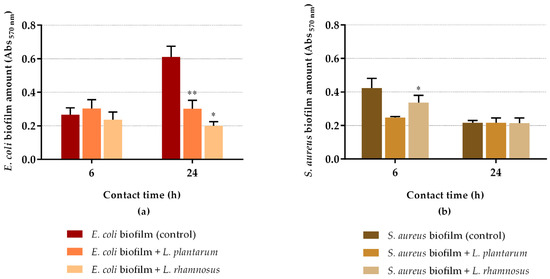 Figure 3. Total amount of E. coli (a) and S. aureus (b) biofilms after 6 h and 24 h of contact with probiotics (L. plantarum or L. rhamnosus). The data present the mean and SD of at least three independent experiments. Statistically significant differences between the control and treatment were considered for p-values < 0.05 (* and ** indicate p < 0.05 and p < 0.01, respectively).