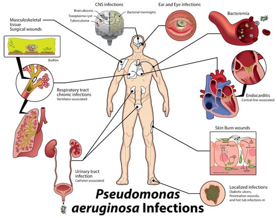 Types of Acute P. Aeruginosa Infections []. P. aeruginosa is prevalent in skin and soft tissue infections (top right) including trauma, burns, and dermatitis. It also commonly causes swimmer’s’ ear (external otitis), hot tub folliculitis, and ocular infections, bacteremia and septicemia, especially in immunocompromised patients, and endocarditis associated with IV drug users and prosthetic heart valves (bottom right). P. aeruginosa can also cause central nervous system (CNS) infections such as meningitis and brain abscess (top left), bone and joint infections, including osteomyelitis and osteochondritis, respiratory tract infections, and hospital-acquired urinary tract infections (UTIs; bottom left). P. aeruginosa is also resistant to many common antibiotics [].
