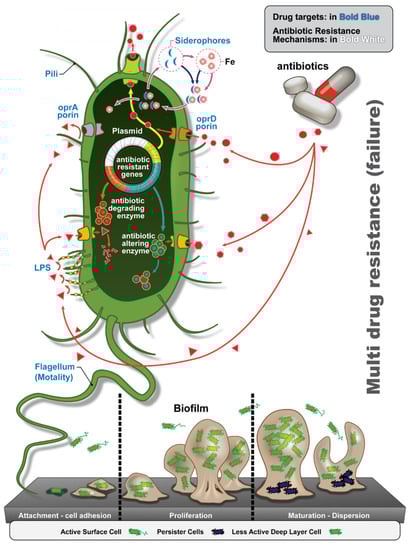 Antibiotic resistance continues to increase through the development of beta-lactamase-producing strains, shifts in porin conformations, efflux pumps, specific antibiotic inactivating enzymes, and non-specific porin modifications [,]. A deeper understanding of the mechanisms of resistance can inform drug discovery and development efforts. A central mechanism in the development of antibiotic resistance is the conversion to coordinated communal biofilm growth. As commensal P. aeruginosa changes to an opportunistic pathogen or acquired pathogenic infection is established, genotypic and phenotypic changes occur. Among the most important, P. aeruginosa switches from a more antibiotic susceptible, motile planktonic phase to an antibiotic tolerant, non-motile biofilm phenotype. This switch represents a key element in the conversion to pathogenicity. Importantly, this mucoid, biofilm phenotype is seen in over 75% of CF-associated P. aeruginosa infections [,]. Once in its sessile phase, P. aeruginosa can attach to host epithelial cell layers to better avoid the host’s immune responses []. Although anti-P. aeruginosa IgA antibodies are also present lining the respiratory tract, limiting the spread of P. aeruginosa to the respiratory epithelium, they have shown to be ineffective at eliminating infection []. Interestingly, antibiotic use may cause IgA deficiency by inhibiting normal microbiota and Toll-like receptor (TLR) signals that induce activating factors of IgA production in plasma cells. Therefore, excessive antibiotic use may further increase the risk of P. aeruginosa infection or reinfection [,]. These problems underscore that passive immunity may provide the safest and most efficacious therapeutic and even potentially prophylactic option. A thorough analysis of the varied mechanisms of antibiotic resistance is beyond the scope of this review, but some of the types of drug resistance mechanisms in P. aeruginosa are shown in Figure 3 for reference.