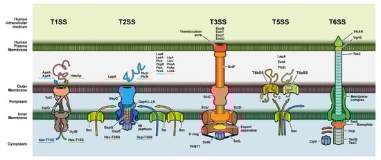 While the previous section focused on virulence factors and other key molecules secreted, targeting key components of the secretion systems themselves may have the same functional consequence. These secretion systems traverse bacterial membranes and are classified into eight distinct types based on their specific structure, composition, and activity. Types I, II, III, V, and VI are particularly relevant due to their significance in the virulence of P. aeruginosa infections, although evidence suggests that P. aeruginosa possesses all eight types [].