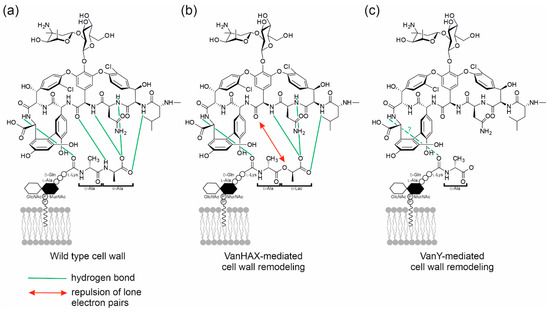 Schematic representation of (a) vancomycin (as a model GPA), interacting with the d-Ala-d-Ala terminus of the lipid II pentapeptide stem of a Gram-positive cell wall, forming five hydrogen bonds [10]; (b) in the cell wall remodeled by the action of VanHAX, the d-Ala-d-Lac termini of lipid II pentapeptide stem interacts with a significantly lower (1000 fold lower) affinity with vancomycin, due to the formation of only four hydrogen bonds and the repulsion of lone electron pairs between oxygen atoms [11]; (c) in the cell wall remodeled by the action of VanY d,d-carboxypeptidase, the lipid II pentapeptide stem is truncated by the excision of the terminal d-Ala, and vancomycin affinity for this target appears significantly reduced, although to which extent has not been investigated yet.