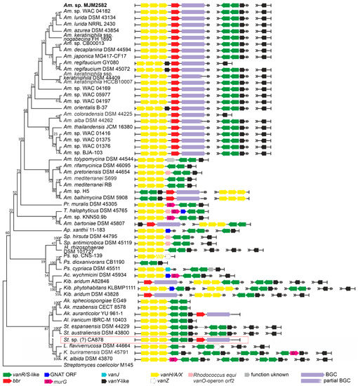 - Waglechner, N.; McArthur, A.G.; Wright, G.D. Phylogenetic reconciliation reveals the natural history of glycopeptide antibiotic biosynthesis and resistance. Nat. Microbiol. 2019, 4, 1862–1871. [Google Scholar] [CrossRef] [PubMed]