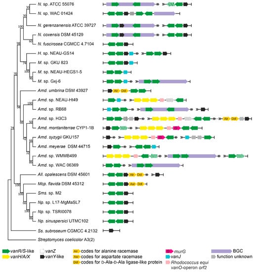 Order Streptosporangiales is the source of valuable lipidated dalbaheptides, such as A40926 from Nonomuraea gerenzanensis ATCC 39727, which is the precursor of second-generation dalbavancin [4,37]. In addition, N. gerenzanensis was the first model for studying the role of VanY-like carboxypeptidases in self-resistance [38,39]. Other known GPA producers are Nonomuraea coxensis DSM 45129, recently reported to produce the lipoglycopeptide A50926 [40], and Nonomuraea sp. ATCC 5507, which produces the type V kistamicin [41]. Here, we analyzed the genomic records from 228 Streptosporangiales spp. (Supplementary Excel File S1). vlgs were found in 63 out of them (Table 1, Supplementary Excel File S2). vanY-like genes were the most abundant, in almost all cases being co-localized with vanRS-like regulatory pairs (although few “orphan” ones were also found). vanHAX operons were not found so often, coming exclusively from Actinomadura spp.; anyhow, the vanHAX operon was never found associated with vanY-like genes. Accessory vlgs, such as vanJ, were found rarely and tended to be co-localized with the vanRS-like regulatory pairs. Only in one case—in Actinomadura sp. H3C3—a vanZ pseudogene was discovered, co-localized with vanRSY.