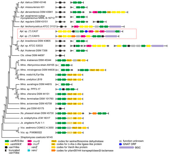 VanA d-Ala-d-Lac-ligases. Overall, from previous works, it seems plausible that VanA d-Ala-d-Lac-ligases are a specialized evolutionary branch of d-Ala-d-Ala ligases (Ddl) involved in the “primary metabolism” of the cell wall in actinobacteria [64]. As reported above, Ddl-like proteins were also found encoded in metagenomic-sourced CA37, CA915 and in the auk BGCs; additionally, in the Micromonosporales we found a peculiar putative pdx operon (see Section 2.1.3) composed of genes for a PALP threonine dehydratase, a Ddl-like ligase and a VanX-like dipeptidase, adjacent to a vanRS-like regulatory pair. Thus, here we decided to test the phylogeny of the VanA ligases together with the above-mentioned Ddl-like proteins on a background of ‘house-keeping’ Ddl-ligases from the main actinobacterial orders. The protein set (see Section 4) used for this phylogenetic reconstruction contained 153 VanA ligases from actinobacteria and low G-C Gram-positives, 12 Ddl-like ligases from Micromonosporales spp., the 3 Ddl-like ligases from CA37, CA915 and auk BGCs, as well as 81 ‘house-keeping’ actinobacterial Ddl-ligases.