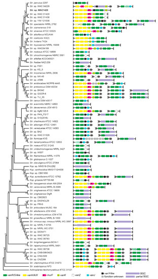 Although multiple genomes of Streptomyces spp. were sequenced (definitively more than in the other orders belonging to Actinobacteria phylum), only few Type I–IV GPA BGCs are known for this genus. These are A47934 BGCs from Streptomyces toyocaensis NRRL 15009 [48] and pekiskomycin BGCs from Streptomyces spp. WAC 04229 (WAC4229) and WAC1420 [49]. Our current analysis involved 1138 genome assemblies of Streptomycetales spp. (Supplementary Excel File S1), but no other novel BGC for Types I–IV GPA was found (Supplementary Excel File S2). On the contrary, BGCs for Type V GPAs and feg-like BGCs were found in 44 assemblies—all Streptomyces spp. except two Kitasatospora spp. Some of these BGCs were already reported [18], but we identified new ones (see Supplementary Excel File S2). vlgs were found exceptionally widespread in Streptomycetales spp.: more than one third of the analyzed genomes (418) contained vlgs (Table 1, Supplementary Excel File S2). Once again, we observed no correlation between the distribution of vlgs and of the GPA-like BGCs. More detailed analysis of 76 Streptomycetales spp. genomes (including 46 genomes carrying GPA- and feg-like BGCs) showed several different combinations, where certain strains carried a putative Type V GPA BGC and no vlgs (e.g., Streptomyces fradiae NKZ-259, Figure 5) along with strains carrying Type V GPA BGCs and a full set of vlgs (e.g., Streptomyces sp. NRRL WC-3897, Figure 5). Additionally, different combinations of vlgs were found in strains carrying no GPA-like BGCs. One peculiar trait of Streptomycetales spp. carrying the canonical vanHAX-vanRS operons was the presence of vanK, coding for an enzyme belonging to the Fem family, which adds the branch amino acid(s) to the stem pentapeptide of the peptidoglycan precursors carrying the d-Ala-d-Lac termini [50].