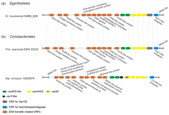 A scheme of putative MGEs found in (a) Er. mucosicola (Eggerthellales) and (b) Coriobacteriales spp. Pvb. caecicola and Atp. minutum (note that this MGE contains vanW gene – coding for a protein of unknown function). MGEs from Er. mucosicola and Pvb. caecicola seem to be almost identical (identical genes are joined with gray dashed lines), while MGE from Atp. minutum differs from both. The legend below the figure explains the color-coding of the scheme.