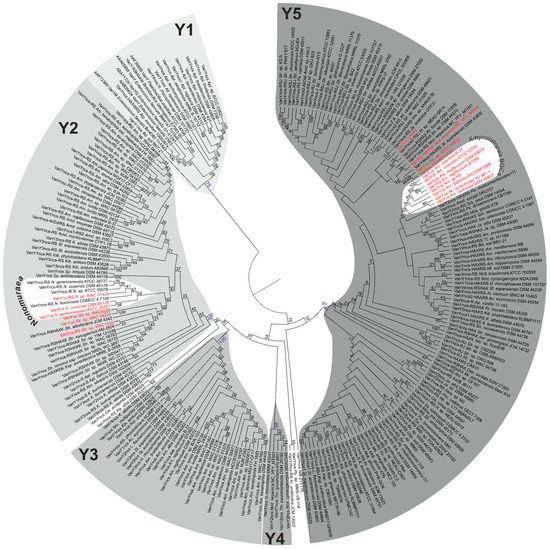 Maximum Likelihood phylogenetic tree of 251 VanY-like M15B carboxypeptidases. To show the topology of the tree better, branch lengths were ignored; the same tree drawn to scale is given in ESM Figures S3–S7. Five well supported clusters—Y1 to Y5—were distinguished on the tree. “cs/ncs” abbreviations in the label at the tip of each branch mean “cluster-situated/non-cluster-situated”. BGC-encoded proteins are given in red. Importantly, the most-studied VanYn (Dbv7) from the A40926-producing N. gerenzanensis ATCC 39727 [62] belongs to Y2, while VanYAb (coming from the balhimycin producer Am. balhimycina DSM 5908 [63]) belongs to the Y5 cluster.