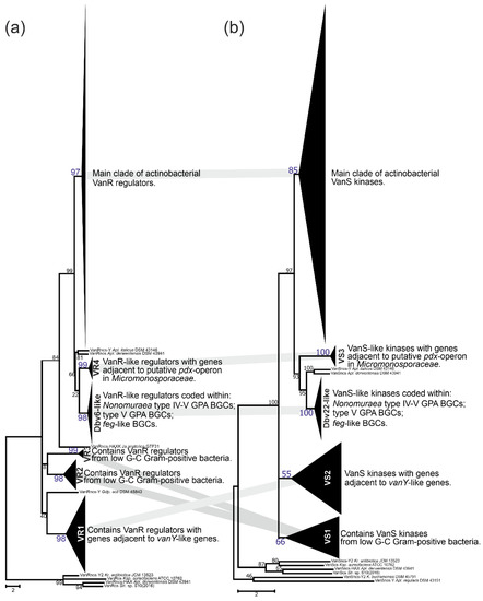 In the course of our screen for vlgs, many of them were found co-localized with vanRS-like regulatory pairs. vanRS-like regulatory pairs were also found adjacent to (i) a putative pdx operon in Micromonosporales; (ii) putative operons formed with genes coding for alanine/aspartate racemase, Ddl and VanY-like carboxypeptidase (such as in All. opalescens DSM 45601 and Mcp. flavida DSM 45312, respectively, Figure 3); or (iii) genes for β-lactamases (such as in Xa. phaseoli DSM 45730, Figure 4). Additionally, multiple BGCs for Type V GPAs and feg-like BGCs from Streptomyces, Microbispora and Actinomadura spp., as well as for Type IV GPAs from Nonomuraea spp., were found to carry vanRS-like regulatory pairs. To clarify if, how and to what extent all these VanR-like response regulators and VanS-like sensor histidine kinases are related to each other and to the VanRS proteins from low G-C Gram-positives, we reconstructed separate phylogenies of the two datasets: one for the VanR- and another for the VanS-like proteins. The first dataset contained 295 proteins, while the second was composed of 313 proteins. Such a discrepancy in numbers derives from the fact that the vanRS-like pairs often lacked one of the genes or had it impaired (as pseudogene). Overall, the final topology of both trees was quite coherent, implying the co-evolution of the VanR- and VanS-like proteins coded within one gene pair (Figure 11); this allowed us to define a set of well-supported clusters (named VS in the VanS and VR in VanR trees). Both trees showed a set of clusters formed as basal clades as well as defined crown groups. Basal clades formed VR1–4 clusters plus a Dbv6-like cluster in the VanR phylogenetic tree, and VS1–3 clusters plus a Dbv22-like cluster in the VanS phylogenetic tree. These data were consistent with what was previously reported on Dbv6/Dbv22, which is a cluster-situated two-component regulatory pair in A40926 BGC from N. gerenzanensis, not grouping with the “classic” VanRS-like proteins from other GPA BGCs [66].
