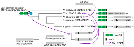 Moreover, vlgs and GPA BGCs seem to have a shared, complex co-evolution pattern. We were able to reconstruct one of the most obvious ones, observed for the self-resistance phenotype in the A40926 producer N. gerenzanensis, which relied on the expression of the cluster-situated vanY-like gene—dbv7. In the corresponding dbv7 knockout mutant, GPA resistance was significantly reduced, but not completely abolished [62]. Screening the full genome of N. gerenzanensis [67], the reason became evident: an additional vanY allele was found far away the dbv BGC. Interestingly, this allele was co-localized with a vanRS-like regulatory pair, whereas dbv7 was not. The same situation was observed for N. coxensis DSM 45129—a recently described producer of A40926-like Type IV GPA [40,68]: a cluster-situated dbv7 homologue (almost identical) and a non-cluster-situated vanRSY-triad were identified in its genome. The two other screened genomes of Nonomuraea spp.—the GPA non-producing N. fuscirosea CGMCC 4.7104 and the kistamicin producer Nonomuraea sp. ATCC 55076—contained close homologues of the vanRSY-triad. In addition, the genome of the other putative GPA producer Nonomuraea sp. WAC 01424 presented the GPA BGC just upstream the vanRSY-triad, while no vanY-allele was found in the BGC itself. Finally, in our reconstructed phylogeny of VanY-like carboxypeptidases, the dbv and noc cluster-encoded VanY-proteins out-grouped (Y1 cluster) all other ones (Figure 10). We believe that such a picture is as a result of a series of HGT events. In our hypothesis, summarized in Figure 12, first, noc and dbv protoclusters recruited the vanY gene from the vanRSY triad present in the common ancestor of Nonomuraea spp., whereas the WAC 01424 and kistamycin ancestral BGCs did not acquire it. Then, noc and dbv, through another HGT event, were introduced in the Nonomuraea ancestors already carrying the vanRSY triad. Another HGT event delivered WAC 01424 BGC to Nonomuraea sp. WAC 01424 and kistamycin BGC to Nonomuraea sp. ATCC 55076, explaining why the vanRSY triad is the only resistance determinant in these strains. Finally, no such HGT event occurred in N. fuscirosea CGMCC 4.7104, leaving this strain without any GPA BGCs but still carrying the vanRSY triad.