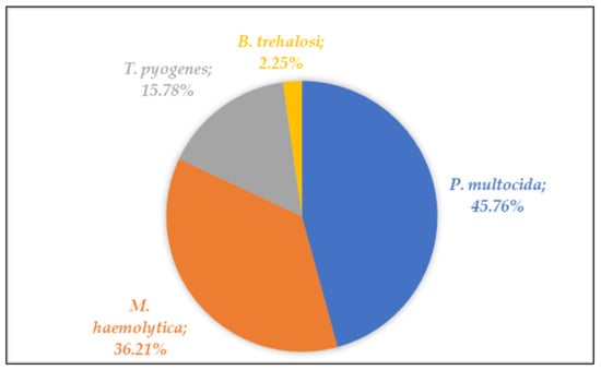Data included in the present study were collected within the scope of the state veterinary laboratory diagnostics at the Bavarian Health and Food Safety Authority. In the present study, the investigated samples originated from calves, cattle, or dairy cows with putative symptoms of BRD in Bavaria, Germany, from July 2015 to June 2020. In the present study, cows were kept in dairy farms solely for the purpose of milk production, in fattening farms, cattle were kept for meat production, and finally, in mixed farms, both categories of animals were kept. In order to prevent bias and over-representation of clonal isolates, only one isolate of a species per farm per quarter year was included in the data set, following previous publications [36,68].