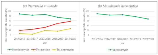 Spectinomycin from the aminocyclitol class cannot be recommended for the treatment of BRD due to an unfavorable resistance situation (Table 2). With a proportion of 78.84% not susceptible P. multocida and 80.95 % not susceptible M. haemolytica isolates, spectinomycin represents the antimicrobial agent with the highest proportion of not susceptible isolates in our analysis (Table 2). Moreover, spectinomycin is not among the most frequently used compounds in calf and cattle fattening, and the consumption quantities did not increase in recent years [30,58]. However, a significant decrease of not susceptible isolates against spectinomycin from 88.89% to 67.82% and 90.24% to 68.00% could be seen in P. multocida and M. haemolytica isolates (Table 3 and Table S5, Figure 2a,b).