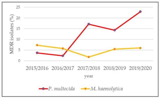 Regarding the BRD syndrome, P. multocida and M. haemolytica were termed MDR isolates if they were not susceptible (intermediate and resistant) to at least one antibiotic substance in three or more antimicrobial classes [38]. Following this definition, our study investigated the prevalence of MDR P. multocida and M. haemolytica isolates under epidemiological aspects.