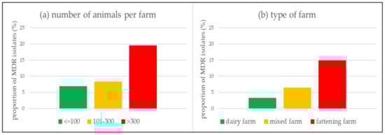 In addition, the odds for isolating MDR isolates were significantly lower in dairy farms (aOR = 0.23; 95% CI: 0.08–0.54; p = 0.002) and mixed farms (aOR = 0.46; 95% CI: 0.20–0.93; p = 0.042) as compared to in pure fattening farms (Table S7). Only 3.29% of isolates in dairy farms were MDR, 6.52% were MDR in mixed farms, while in fattening farms 14.92% were MDR (Figure 4b).