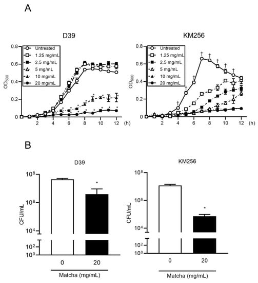Matcha supernatants inhibit the growth of Streptococcus pneumoniae. (A) S. pneumoniae strains D39 and KM256 were cultured in the presence or absence of matcha supernatants (1.25–20 mg/mL) suspended in Trypticase Soy Broth (TSB). Optical density at 600 nm (OD600) of each sample was measured at each time point. Data are shown as the mean ± standard deviation (SD; n = 3 per group) and were evaluated using two-way analysis of variance with Tukey’s multiple-comparisons test. * p < 0.05 versus all other groups; † p < 0.05 versus all matcha supernatant-treated groups. (B) S. pneumoniae strains D39 and KM256 were grown in TSB medium until an OD600 of 0.1 was reached. Thereafter, the bacterial suspensions were incubated at 37 °C for 2 h in matcha supernatant (20 mg/mL). The treated bacteria were plated on sheep blood agar plates, and the colony-forming units were determined. Data are presented as the mean ± SD (n = 3) and assessed using the Student’s t-test. * p < 0.05 versus the untreated group.