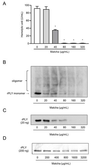 Matcha supernatants decrease PLY-induced hemolysis. Recombinant PLY (rPLY; 1 μg/mL) was preincubated with varying concentrations of matcha supernatant at 37 °C for 1 h. (A) The hemolytic activity in each sample was determined. Data are shown as the mean ± SD (n = 3 per group) and were evaluated using one-way analysis of Dunnett’s multiple-comparisons test; * p < 0.05 versus the untreated group. (B) PLY oligomerization of the samples was detected by western blotting using the anti-PLY antibody clone PLY-4. The experiment was repeated three times, and a representative result is shown. rPLY was co-incubated with the matcha supernatant at 37 °C for 1 h, and the PLY of the samples was detected (C) by western blotting and (D) Coomassie Brilliant Blue staining.