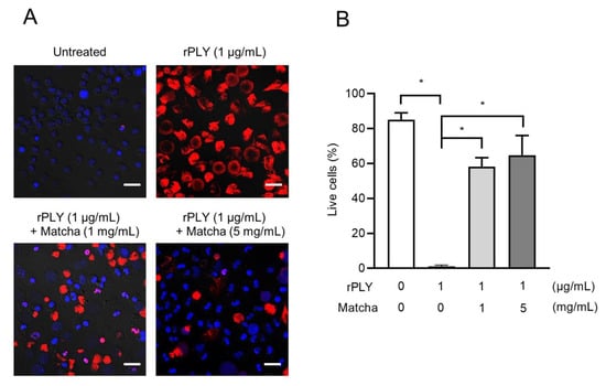 Our previous study demonstrated that PLY induced lysis of human neutrophils []. Therefore, we investigated the protective effects of matcha supernatants on PLY-induced neutrophil death. Figure 3 shows that treatment with rPLY significantly induced neutrophil death. Although rPLY induced cell injury and death, co-incubation with 1 and 5 mg/mL of the matcha supernatant significantly increased the number of viable cells (Figure 3A,B). These findings indicate that the matcha supernatant significantly inhibits PLY-mediated neutrophil injury.