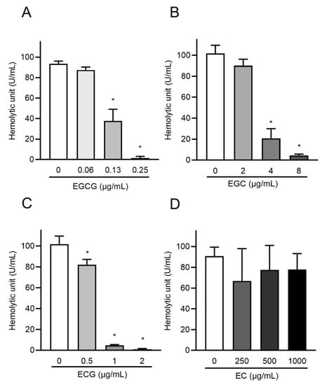 Fresh sheep erythrocytes were centrifuged at 450× g for 10 min and washed three times with PBS. Erythrocytes (1% v/v) in PBS were mixed with rPLY (1 μg/mL) in the presence or absence of varying concentrations of matcha supernatant (20–300 μg/mL) or catechins (0.1, or 1 mg/mL). The samples were incubated at 37 °C for 30 min and centrifuged at 450× g for 10 min. The supernatant was pipetted into flat-bottomed microtiter plates, and hemolysis was measured using a microplate reader (Thermo Fisher Scientific, Waltham, MA, USA). A hemolytic unit is defined as the amount of rPLY contained in 1 mL of PBS that causes 50% lysis of a 1% erythrocyte suspension after incubation at 37 °C for 30 min [].