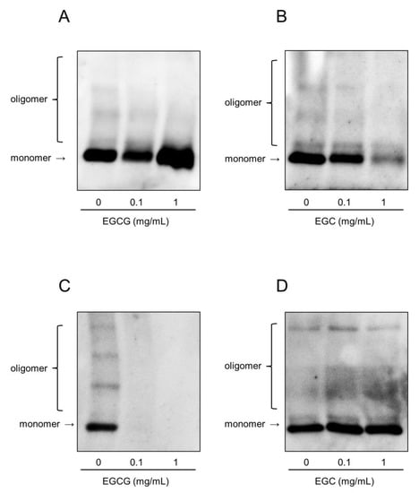 A previous study showed that epigallocatechin gallate (EGCG) in matcha green tea effectively inhibits the hemolytic activity of PLY and that a novel strategy that targets PLY using EGCG is a promising therapeutic option for S. pneumoniae []. We hypothesized that catechins, the major components of matcha green tea, are involved in the inhibition of the cytotoxicity of rPLY. As shown in Table 1, matcha green tea contains various catechins. Additionally, a cup of matcha green tea contained a higher amount of EGCG and ECG than that of sencha green tea. We selected EGCG, epigallocatechin (EGC), epicatechin gallate (ECG), and epicatechin (EC), which are abundant catechins in matcha green tea, and examined their effects on the hemolytic activity of rPLY. Figure 4 shows that EGCG, EGC, and ECG significantly inhibited the hemolytic activity of rPLY in a concentration-dependent manner, while EC had no effect. EGCG significantly inhibited the hemolytic activity of rPLY at concentrations above 0.13 μg/mL, which is within the concentration of 2.17 μg/mL of matcha supernatant. Similarly, EGC and ECG affected the hemolytic activity of rPLY. It has been reported that galloylated catechins such as EGCG and ECG are strong inhibitors of protein activity, and catechins with catechol groups such as EC and ECG have lower antioxidant potential compared to those with pyrogallol groups such as EGCG and EGC [,,]. Our results are consistent with these data and indicate that catechins are involved in the inhibition of rPLY hemolytic activity by matcha supernatant and that the strength of the inhibition varies depending on the type of catechin. Oligomerization analysis was performed to determine whether catechins affect the pre-pore complex of rPLY and mitigate its biological toxicity. Figure 5A–C shows that both oligomeric and monomeric bands of rPLY became thinner after EGCG, EGC, and ECG treatment. Meanwhile, there was no significant change in the oligomeric and monomeric bands when the concentration of EC was increased (Figure 5D). Consequently, EGCG, EGC, and ECG suppress the hemolytic activity of rPLY by inhibiting its oligomerization.