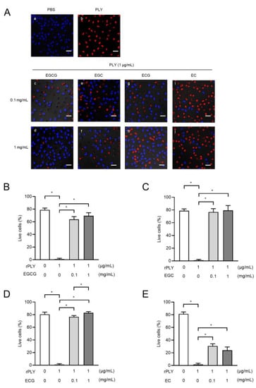 Catechins attenuate PLY-mediated human neutrophil death. (A) Human neutrophils were treated with rPLY (1 μg/mL) in the presence or absence of catechins (0.1 and 1 mg/mL) at 37 °C for 1 h. Representative fluorescence images of cells stained by Hoechst 33342 (viable cells; blue) and ethidium homodimer III (necrotic cells; red) are shown. Scale bars: 20 μm. (B–E) The percentage of Hoechst 33342-positive cells were calculated. Data are presented as the mean ± SD (n = 5 per group) and were evaluated using one-way analyses of variance with Dunnett’s multiple-comparison tests. * p < 0.05 versus the PLY-treated group.