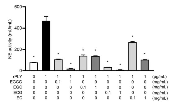 We previously reported that PLY-induced neutrophil death leads to the release of neutrophil elastase (NE), which subsequently damages the surrounding tissues and causes lung dysfunction associated with pneumonia []. Based on Figure 6, we hypothesized that catechins might also inhibit the release of NE by rPLY and performed an NE activity assay in the neutrophil-culture supernatant to test this. Figure 7 shows that all catechins significantly suppressed NE activity in the supernatants obtained from catechin-treated human neutrophils compared to those obtained from neutrophils treated with rPLY alone.