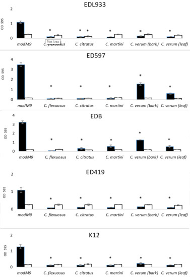 Antibacterial and antibiofilm activity of EOs on E. coli strains. Planktonic growth (white bars) and biofilm formation (black bars) were quantified in modM9 and in modM9 in the presence of EOs, after culture of 24 h in 96-well plates, at 28 °C. Data are presented as mean ± SD of absorbance (at 595 nm). * p < 0.01.