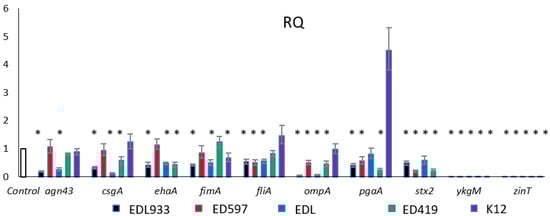 In order to understand the molecular mechanisms behind the inhibitory role of EOs in pathogens, some genes related to biofilm formation and pathogenesis of E. coli were monitored by quantitative real-time PCR. We studied the genes involved in motility (csgA, fliA and fimA), virulence (stx2 and ehaA), membrane protein synthesis (agn43, ompA and pgaA) and zinc homeostasis (ykgM and zinT) in the presence of C. martini EO. Indeed, in the literature, the studies on C. martini EO are very limited and, to our knowledge, this is the first gene expression study with this oil. Thus, initially we analyzed gene expression levels of mRNA isolated from cells treated with C. martini EO. As shown in Figure 2, the examined genes were mainly downregulated in the pathogen strains. The genes involved in the virulence are missing in the non-pathogen K12 strain. In our control EDL933 strain all genes were downregulated, as well as in EDB strain, in which only the pgaA gene was not differentially expressed. pgaA gene belongs to the pgaABCD operon which synthesizes the poly-β-1,6-N-acetyl-D-glucosamine, essential for the cellular architecture of the E. coli biofilm structure. In particular, this gene codes for the exporter of the PGA protein outside the periplasm space. It is noteworthy that this gene was instead highly expressed in the non-pathogen K12, possibly due to a different role of PGA in biofilm formation on plastic material in E. coli O157:H7 and K12 strains [39]. Interestingly, ompA and stx2 were downregulated in all considered strains.