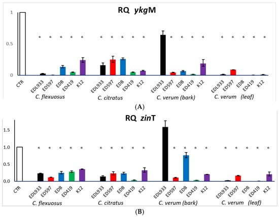 Transcriptional profiles of ykgM (A) and zinT (B) in E. coli cells treated with or without EOs (CTR), obtained by qRT-PCR. Relative gene expressions represent transcriptional levels after exposure to EOs versus untreated controls. The experiment was performed three times. * p < 0.01.
